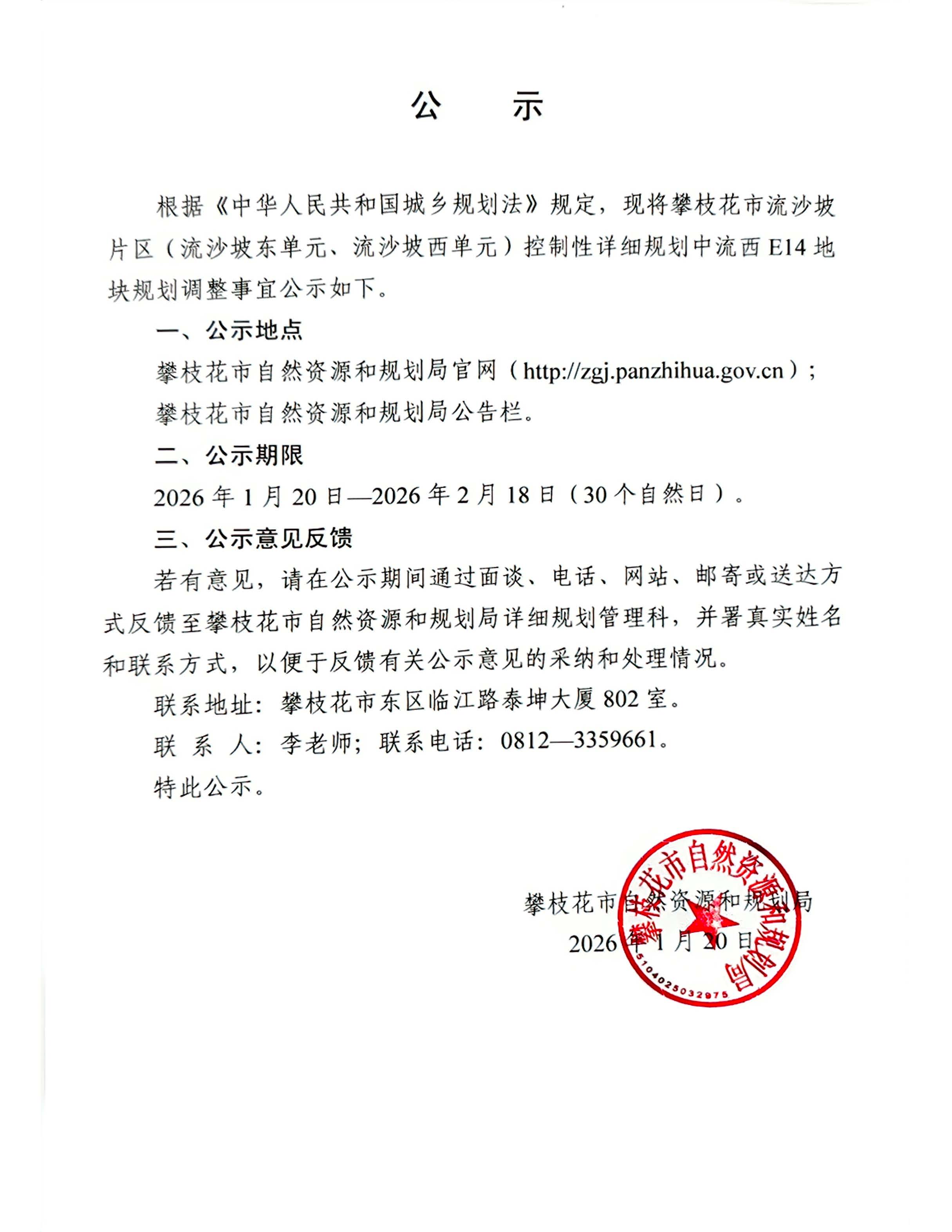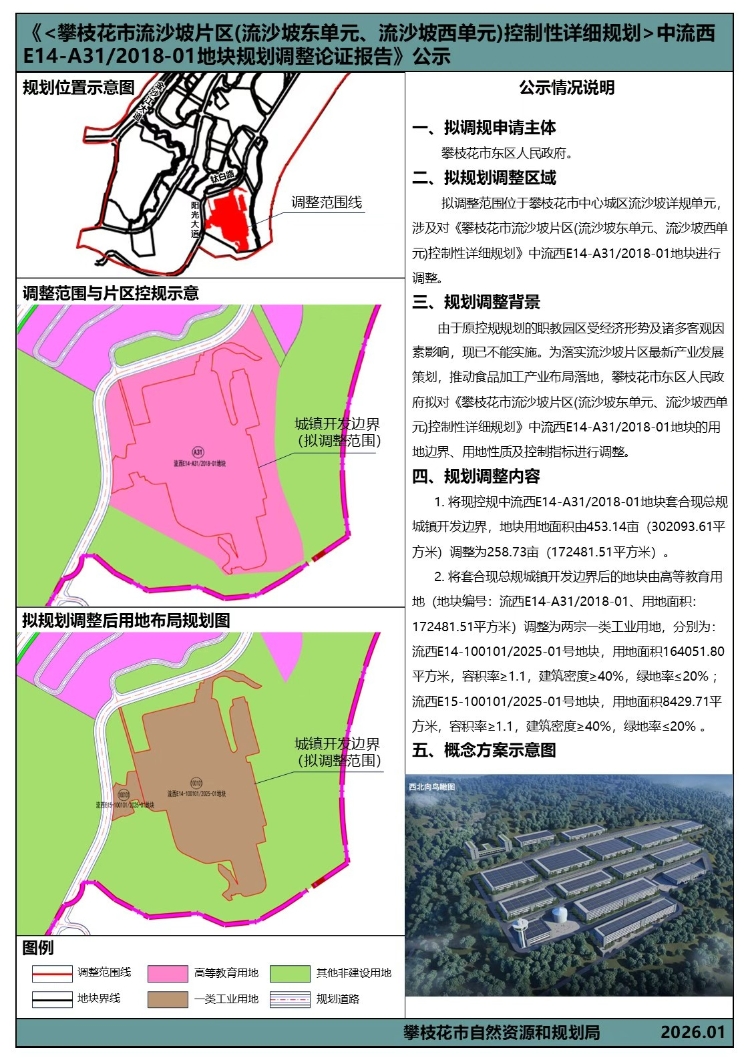 攀枝花市流沙坡片区(流沙坡东单元、流沙坡西单元)控制性详细规划中流西E14地块规划调整事宜公示