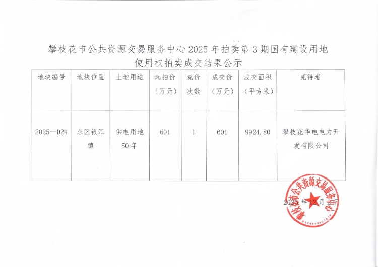 攀枝花市公共资源交易服务中心2025年拍卖第3期国有建设用地使用权拍卖成交结果公示