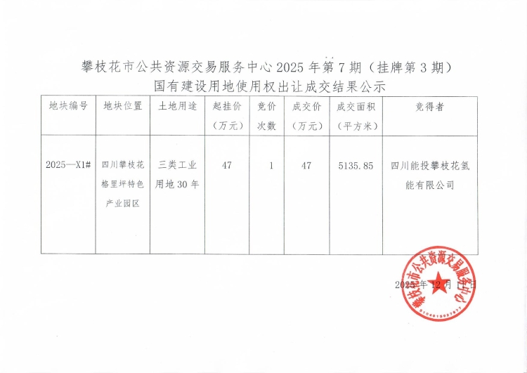 攀枝花市公共资源交易服务中心2025年第7期(挂牌第3期)国有建设用地使用权出让成交结果公示