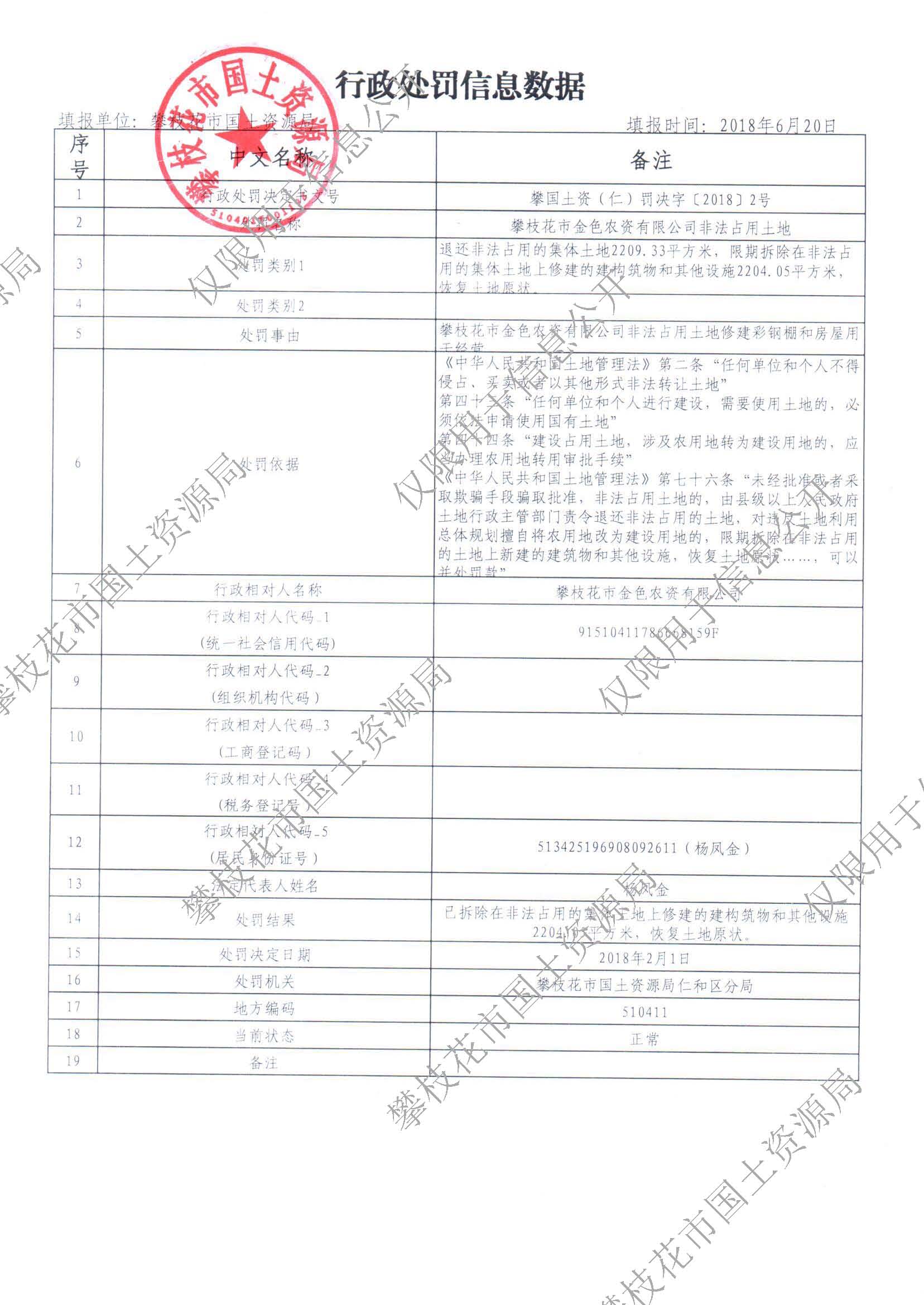 攀枝花市金色农资有限公司非法占用土地