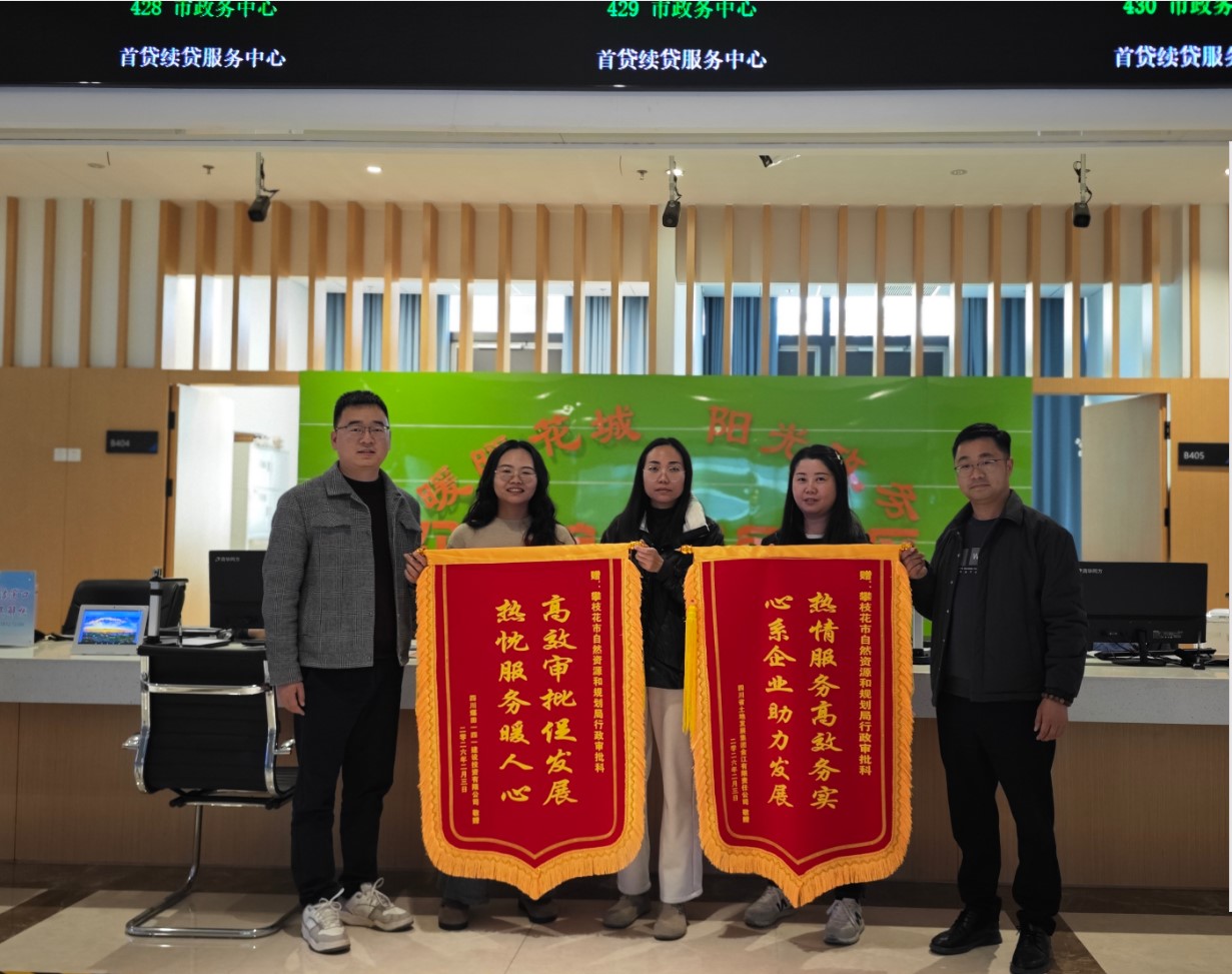 2026年2月5日,四川省土地发展集团金江有限责任公司及四川煤田一四一建设投资有限公司工作人员向攀枝花市自然资源和规划局行政审批科赠送锦旗2面,以感谢行政审批科同志近半年来为企业提供的优质高效服务。