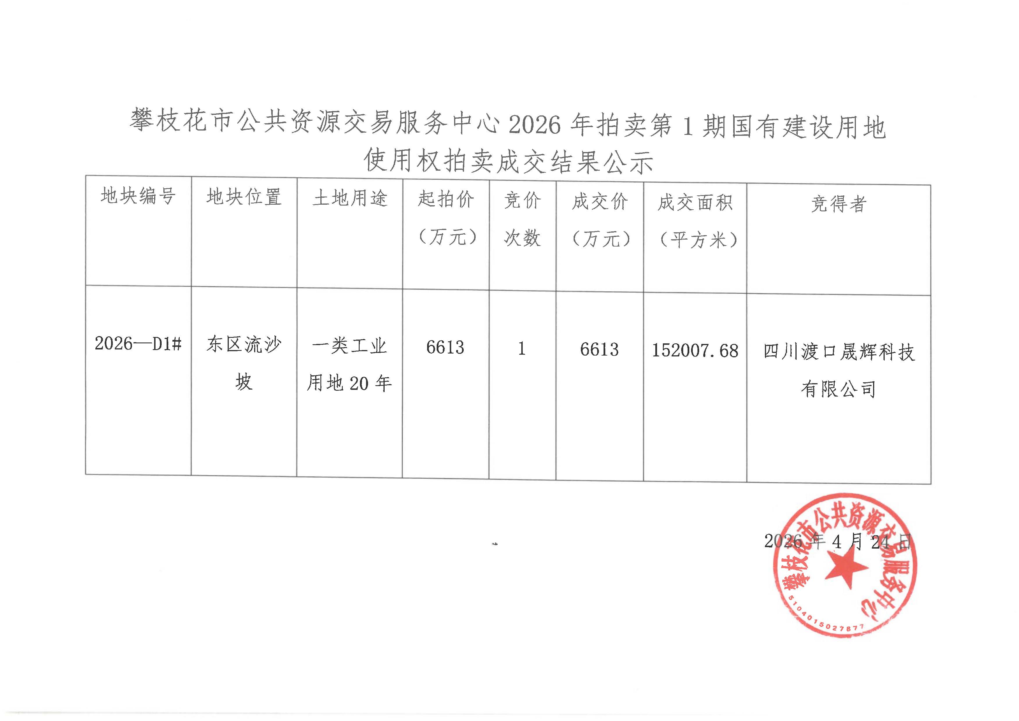 攀枝花市公共资源交易服务中心2026年拍卖第1期国有建设用地使用权拍卖成交结果公示
