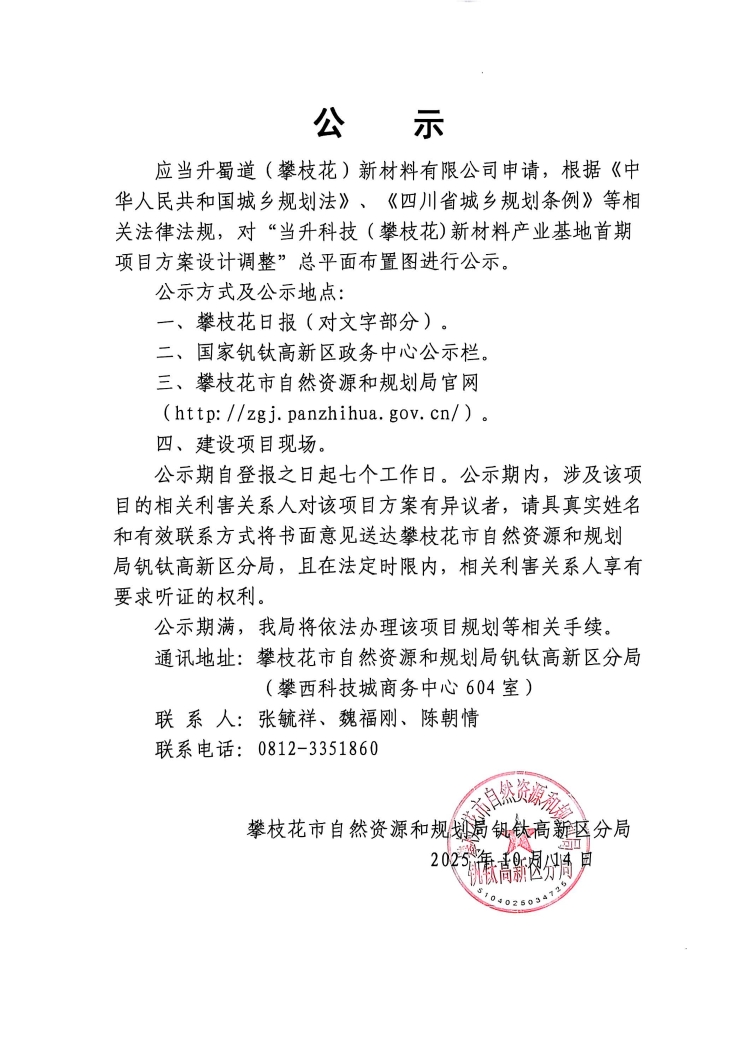 “当升科技(攀枝花)新材料产业基地首期项目方案设计调整”总平面布置图公示