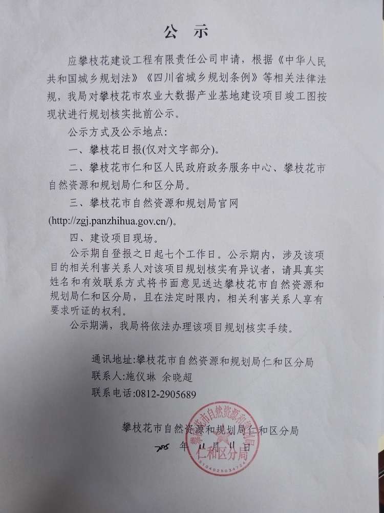 攀枝花市农业大数据产业基地建设项目竣工图规划核实批前公示