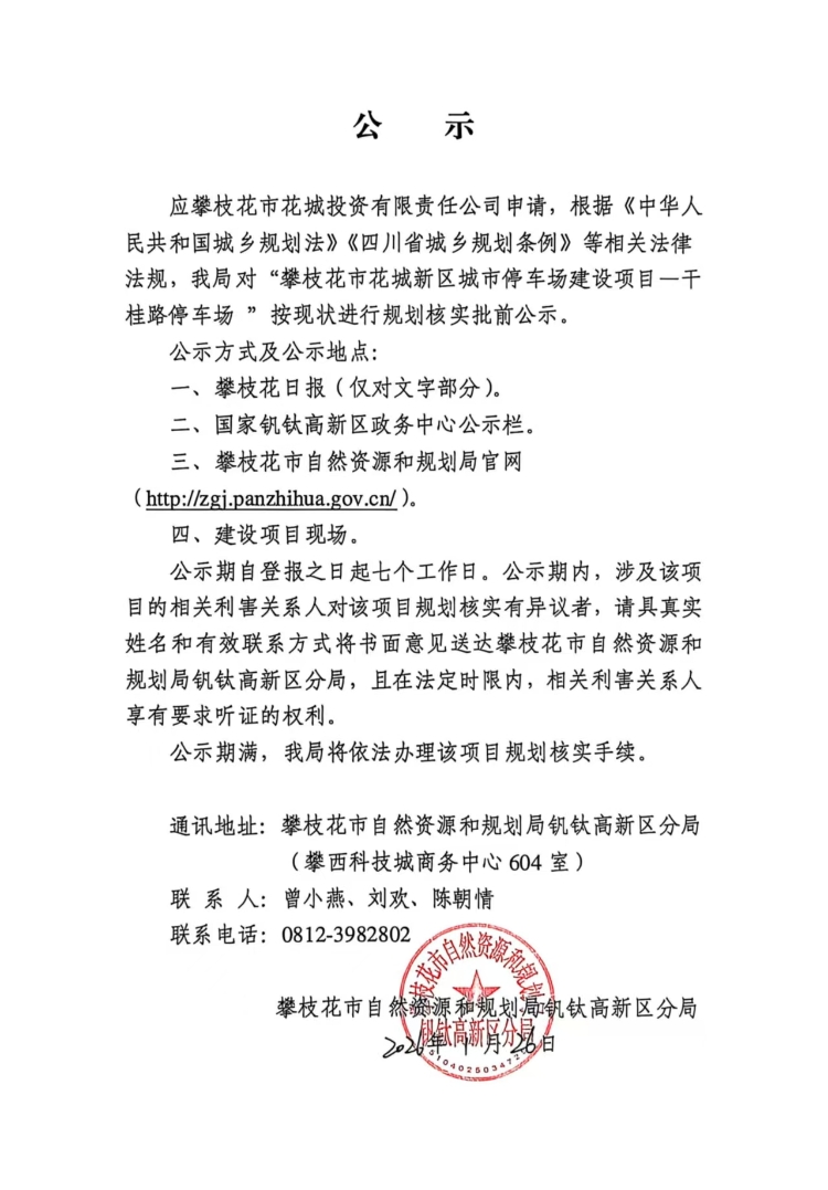 “攀枝花市花城新区城市停车场建设项目—干桂路停车场”按现状规划核实批前公示