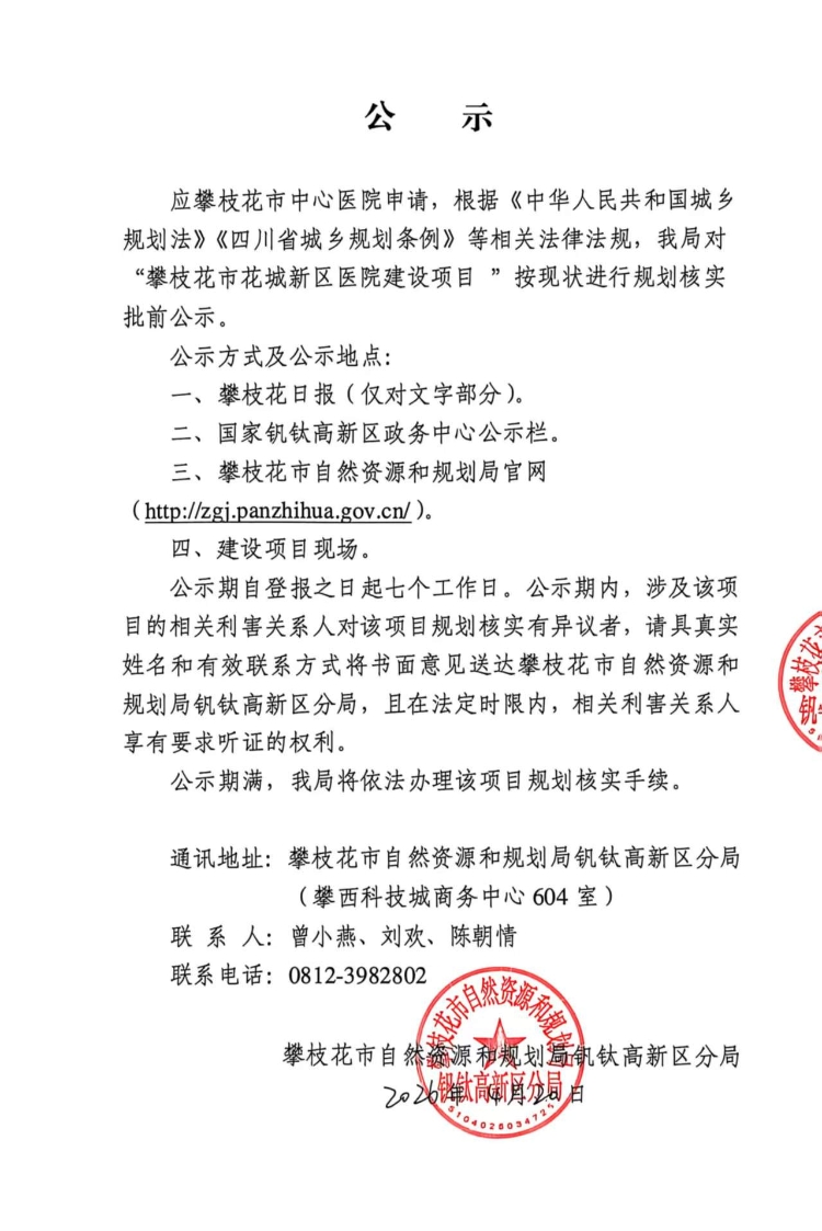 “攀枝花市花城新区医院建设项目”按现状规划核实批前公示