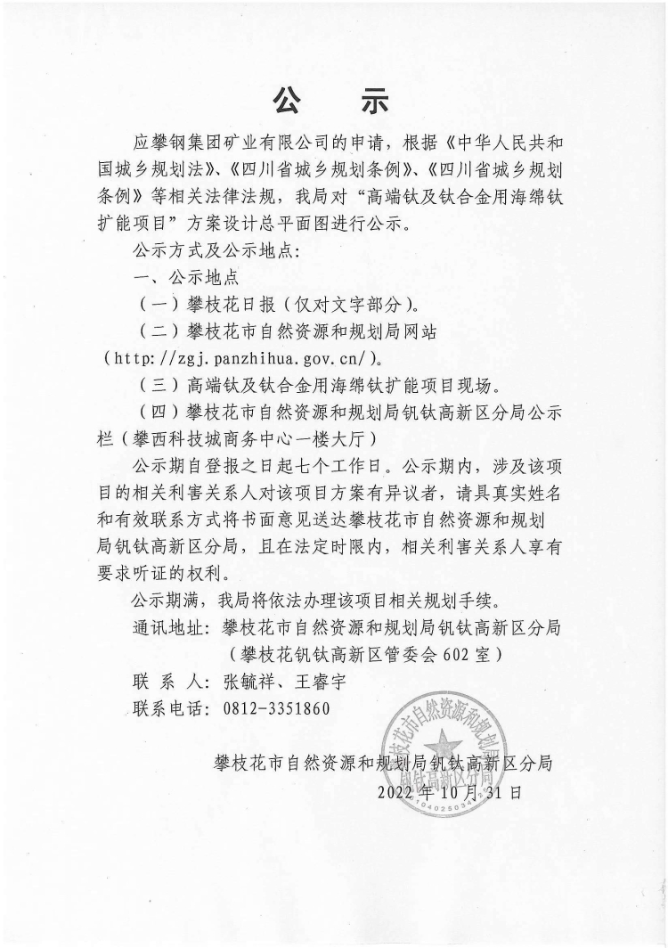 攀钢集团矿业有限公司“高端钛及钛合金用海绵钛扩能项目”方案设计总平面图公示
