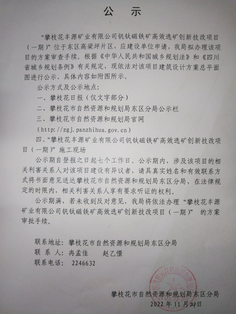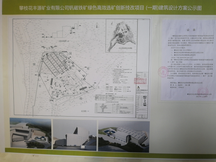 “攀枝花丰源矿业有限公司钒钛磁铁矿绿色高效选矿创新技改项目(一期)”建设设计方案总平面图公示