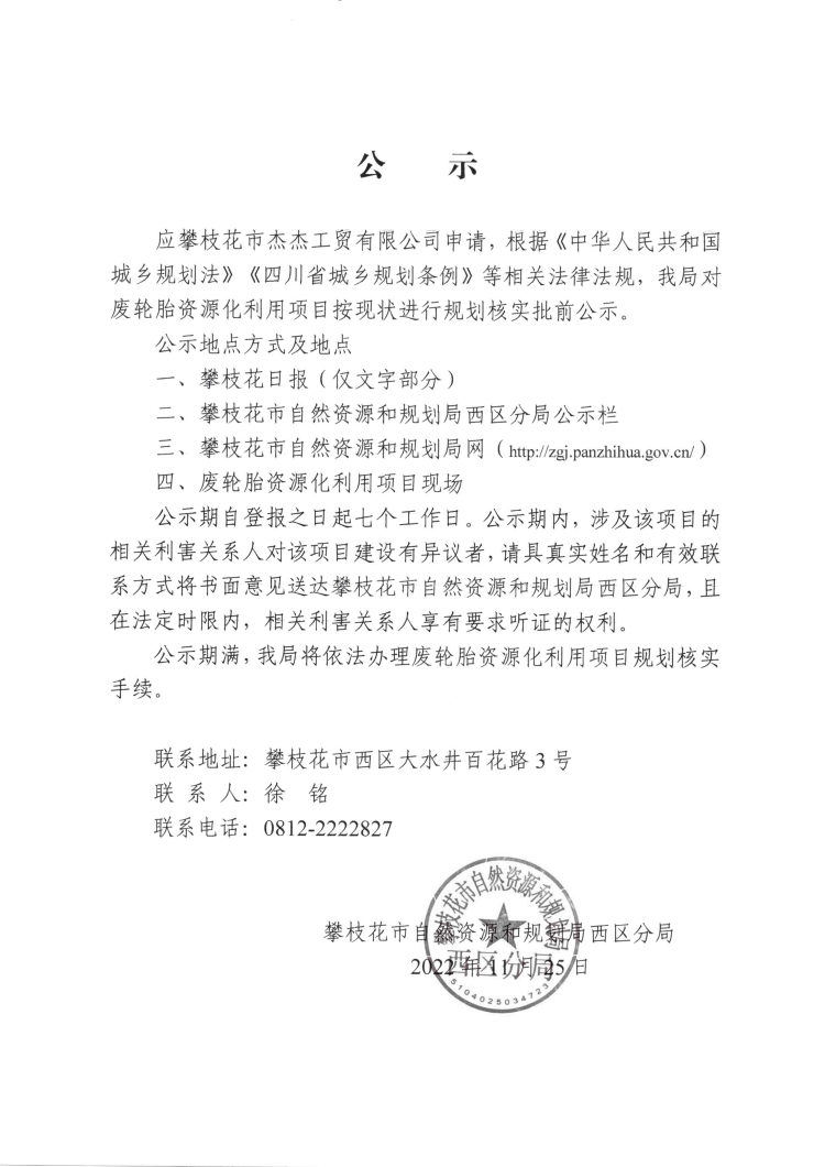 攀枝花市杰杰工贸有限公司废轮胎资源化利用项目按现状进行规划核实批前公示