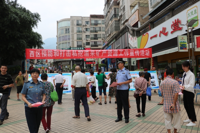 2019年7月22日至29日,我分局联合西区打私办、市场监督管理局、公安分局、农业农村和交通运输局、格里坪镇及江南三个街办等打私责任部门,开展了为期一周的预防和打击私挖滥采矿产资源工作宣传活动。